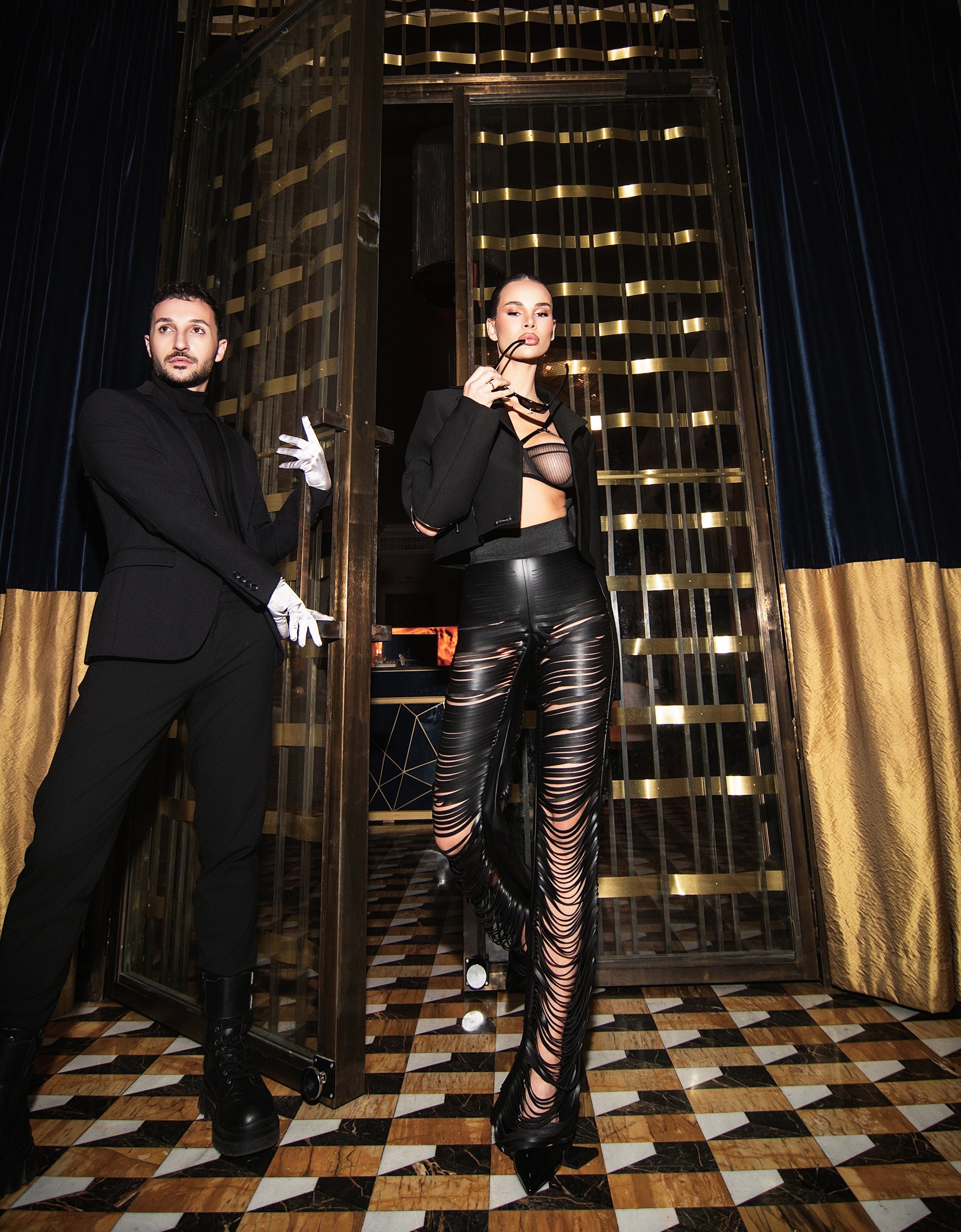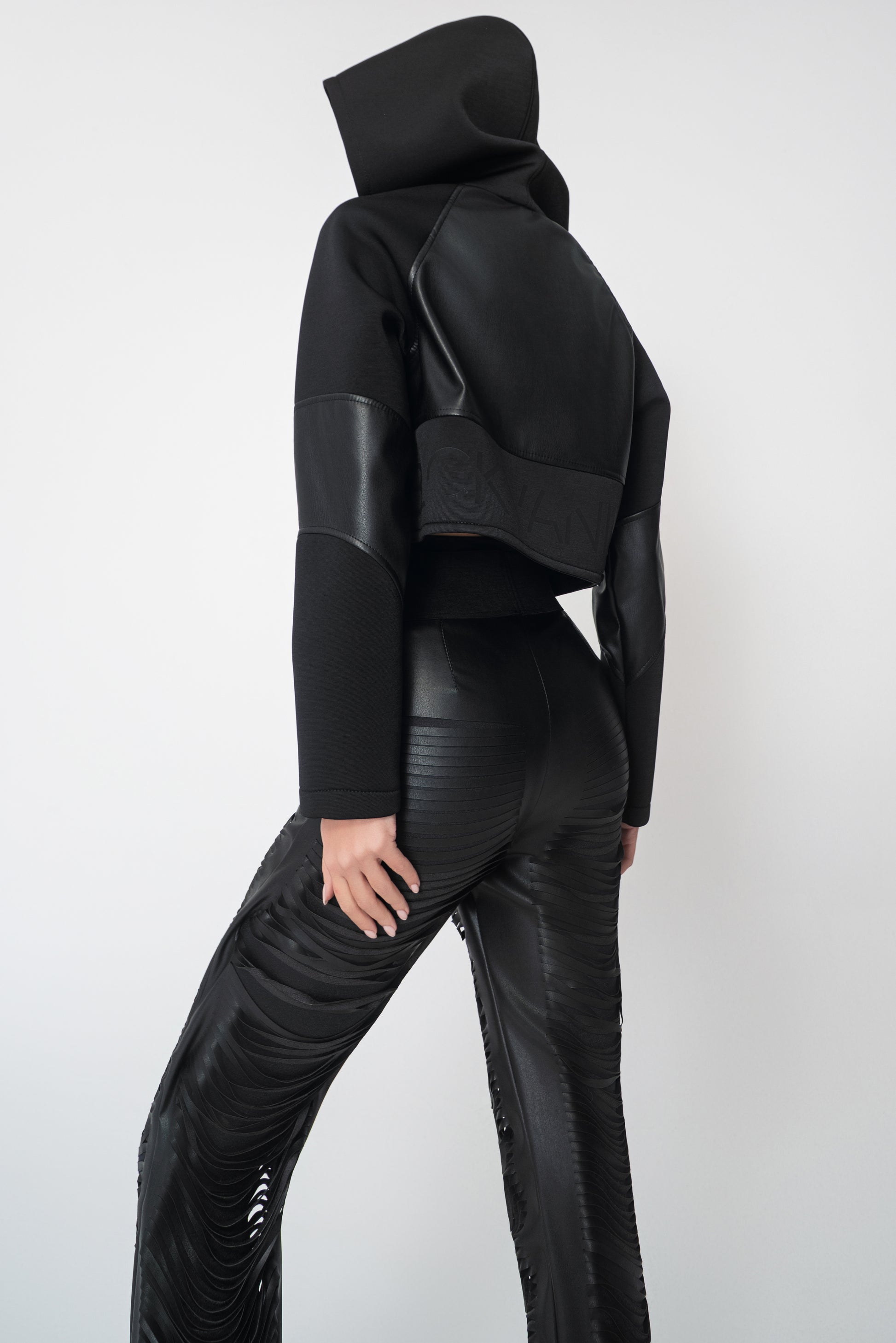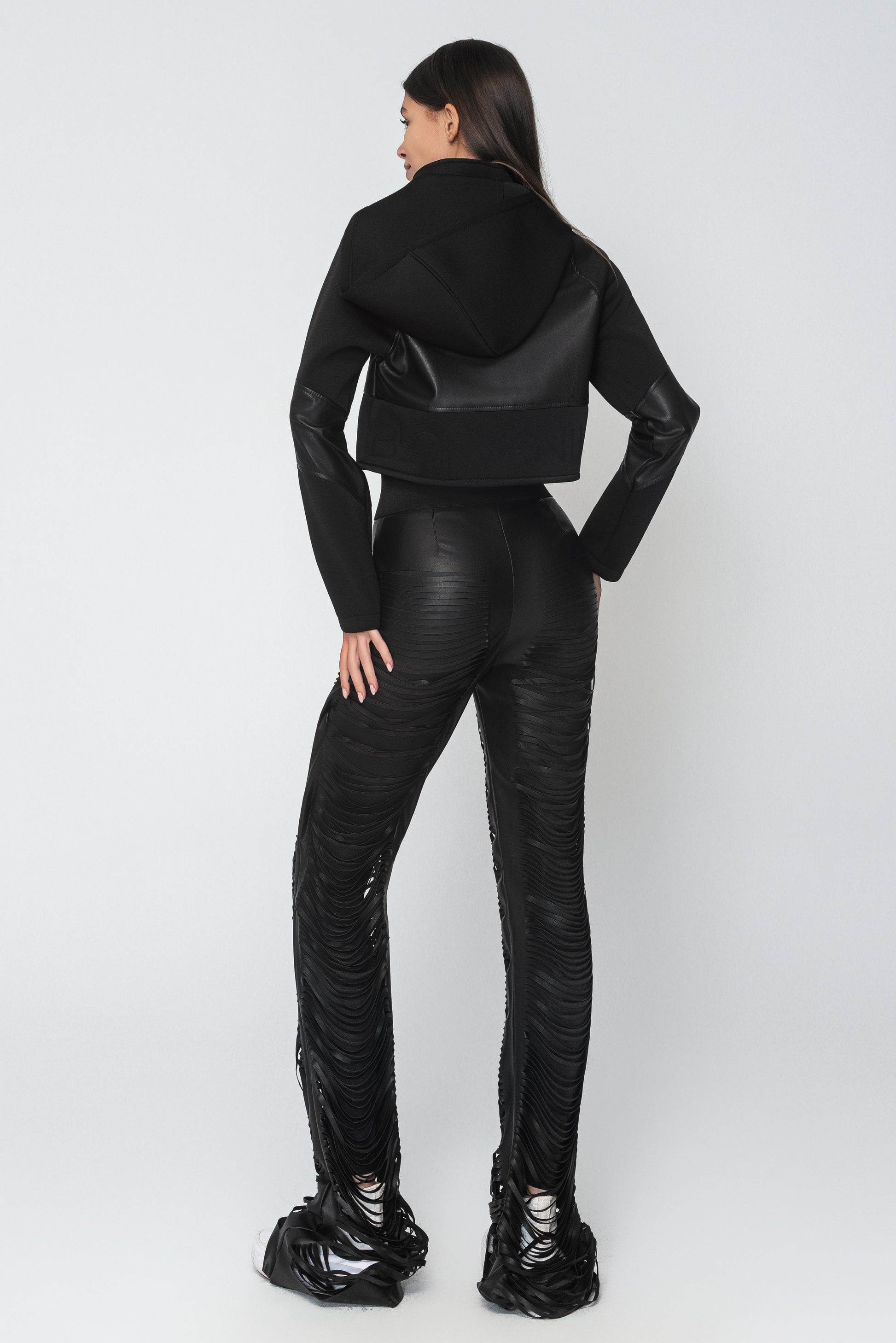Тези модерни кожени панталони са изработени от еластична, плътна еко кожа, която приляга по тялото и подчертава силуета. Дълги, вертикални, лазерно изработени разрези по цялата дължина на крачолите, създаващи смел, авангарден и изключително стилен визиуален ефект.