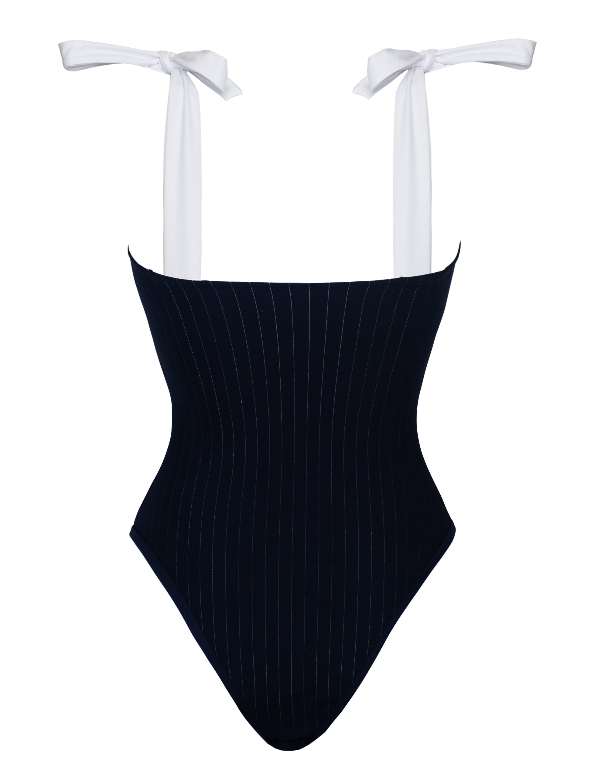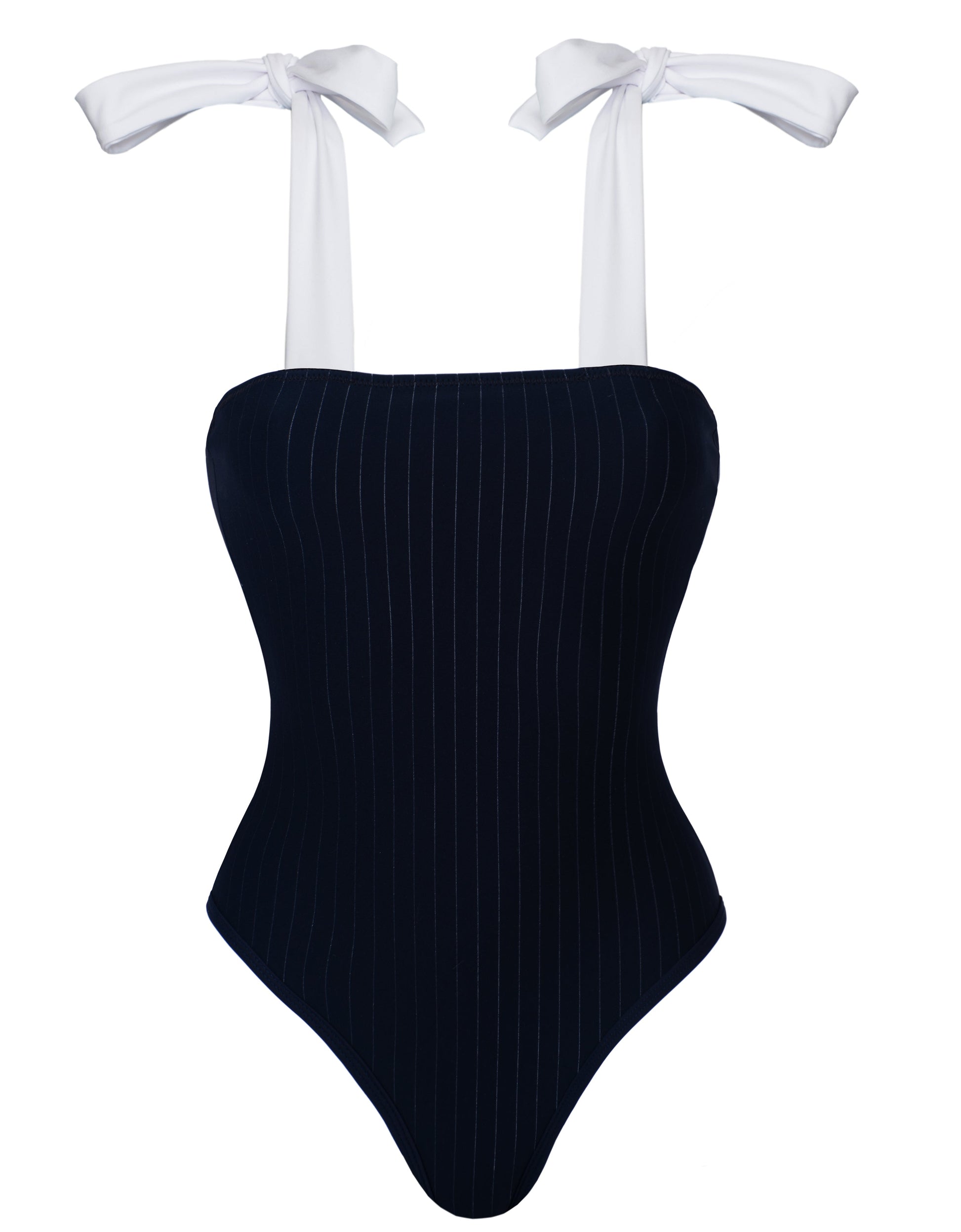 Банският e изработен от невероятно мека и нежна ликра (92% черно и 8% син цвят). Банският е с подплънки. Материята, използвана в изработката на модела е на един от най-високо оценените и качествени брандове - "Brugnoli". Подплатен с изключително мек хастар. Моделът носи размер S.