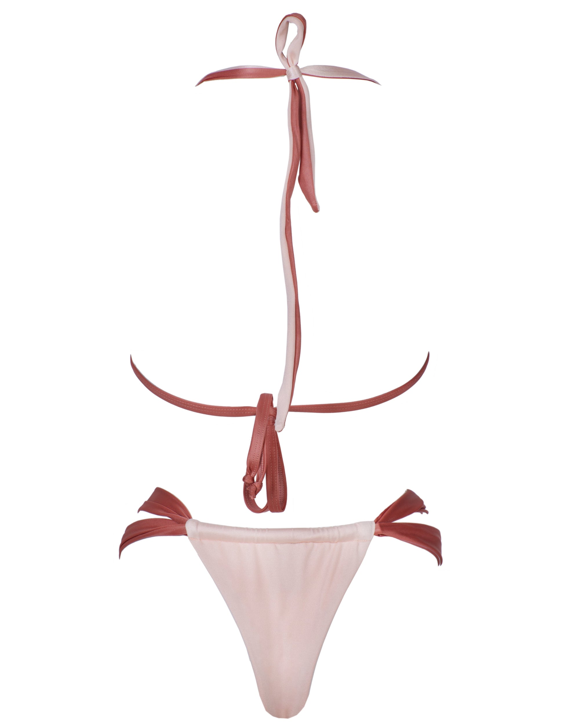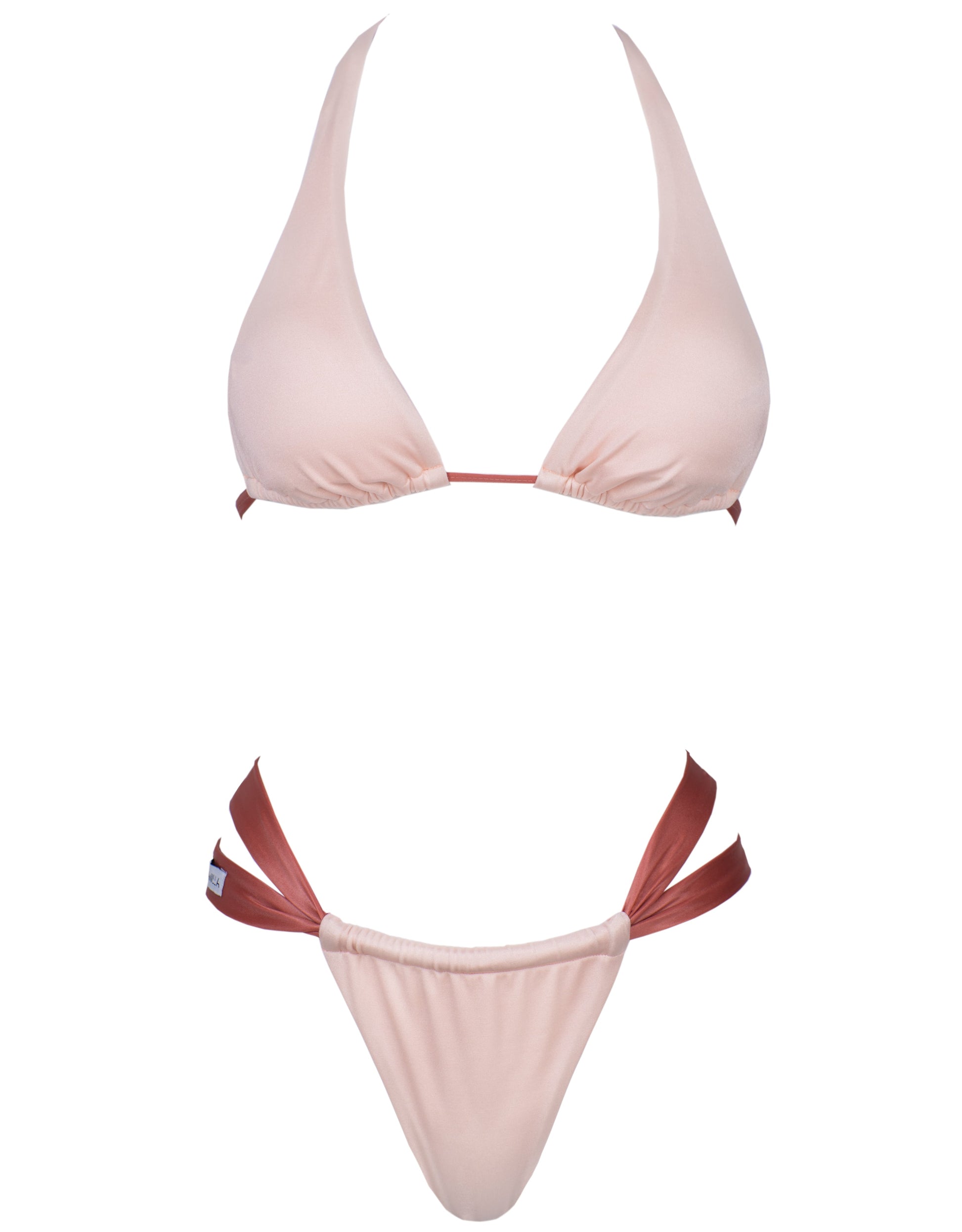Ефектен бански от нежна, качествена ликра. Комплект от две части с свъзможност за поставяне на подлънки и бикина , която може да бъде превърната в прашка с едно движение . Горната част на банския може да бъде носена по два различни начина.